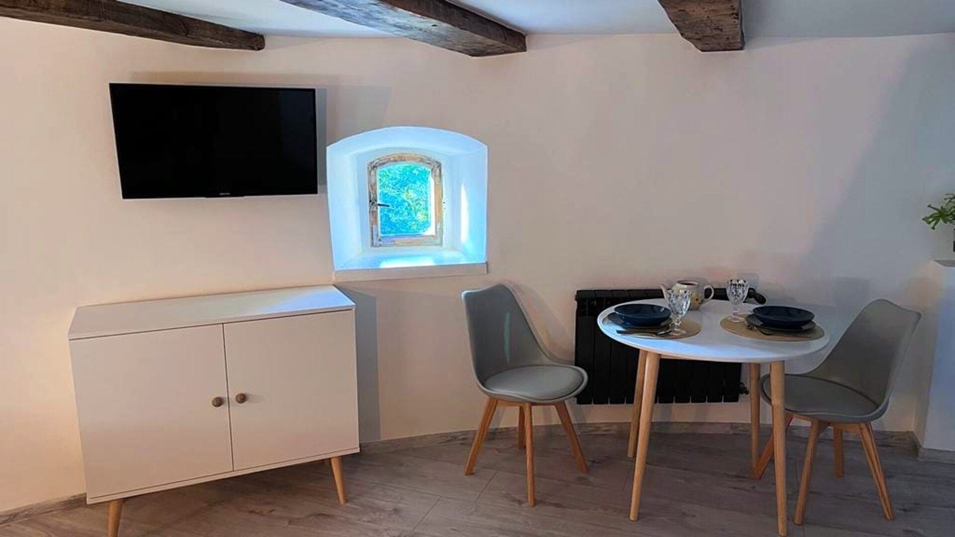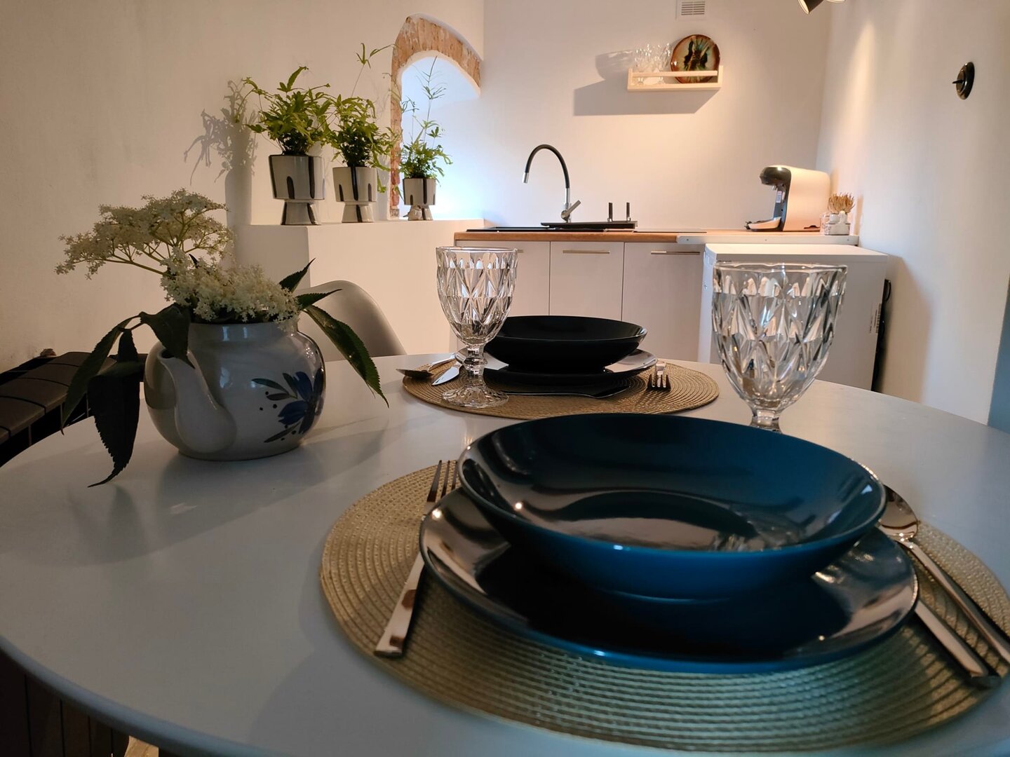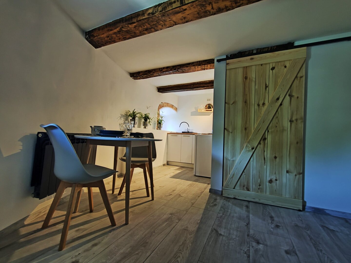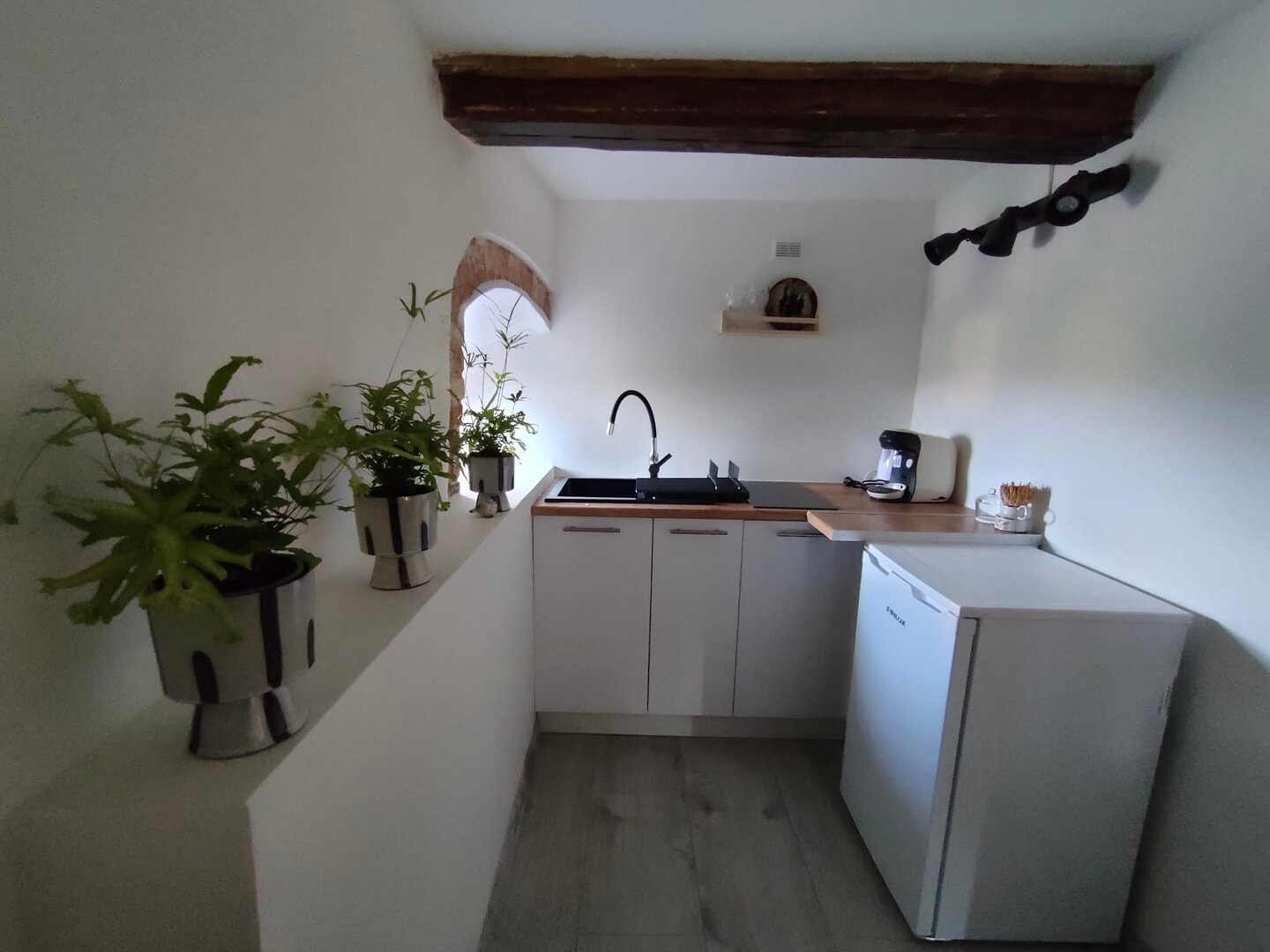 - Aneks kuchenny wyposażony w płytę, lodówkę, czajnik i ekspres ciśnieniowy, część jadalną